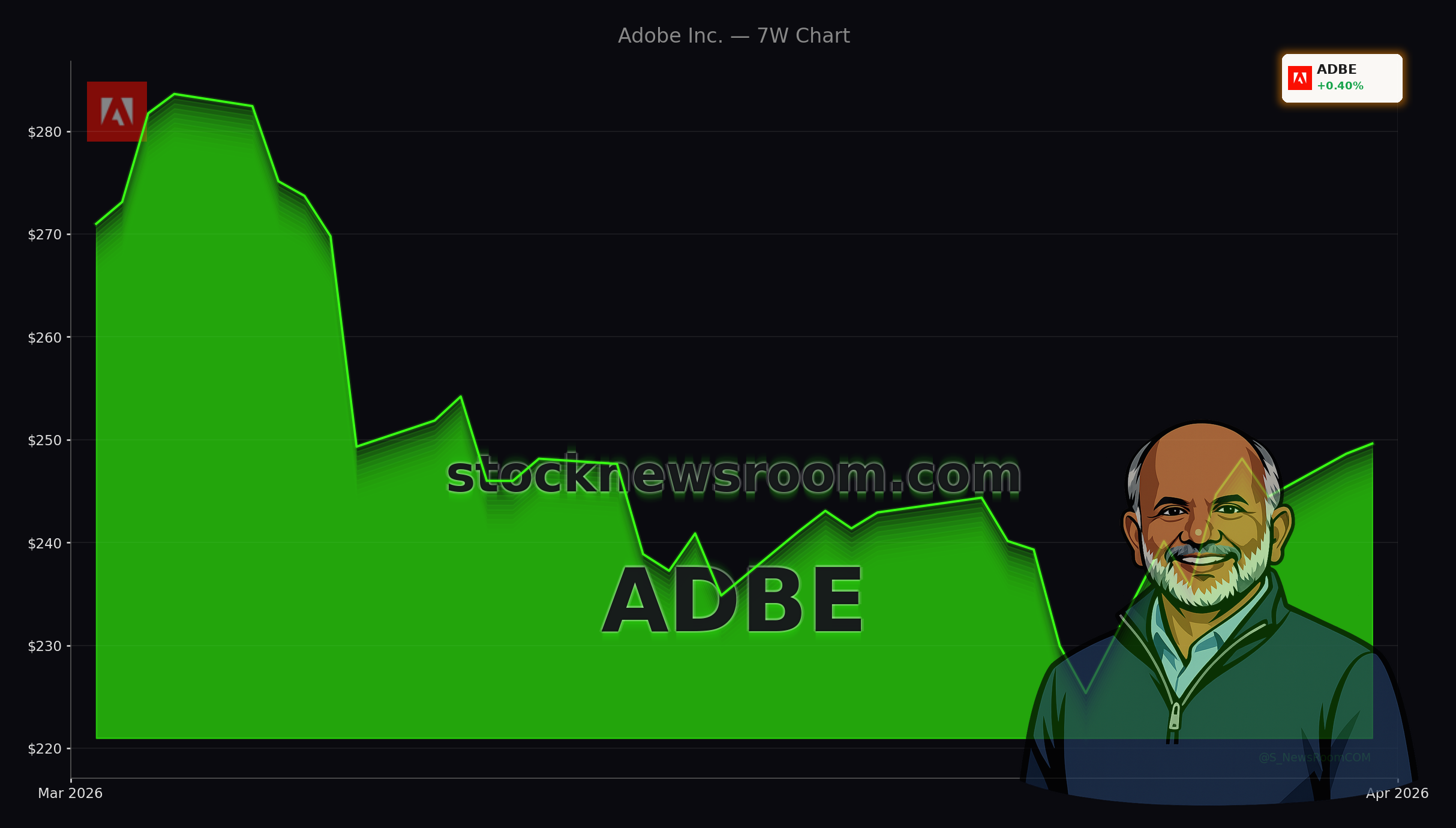 Still, Adobe’s stock remains volatile as Narayen prepares to step down after 18 years as CEO, remaining as board chair during the transition. Leadership uncertainty, intensifying design competition from players like Canva, and AI‑driven disruption in creative tools all weigh on sentiment. At the same time, software as a group has been rebounding on days when growth and AI themes catch a bid, with names like Salesforce, Workday and ServiceNow rallying and Adobe often participating, albeit less aggressively than high‑beta peers.