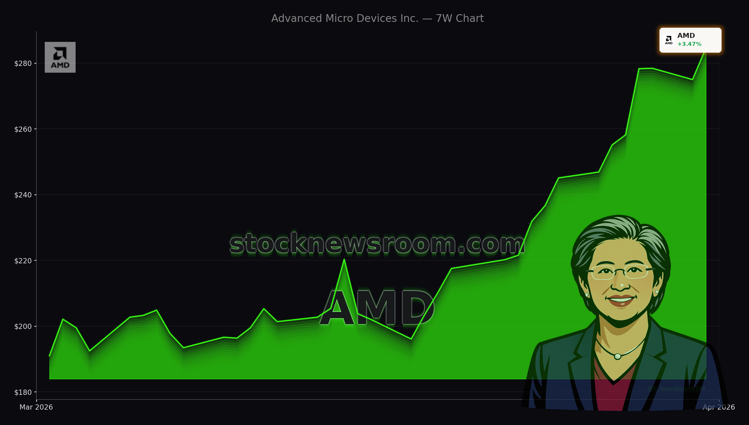 At $284.49 at the close on Tuesday and $287.67 in late trading, AMD is pressing the upper end of its 52-week range and trading close to recent record highs. The stock sits roughly 22% above its 20-day simple moving average and nearly 30% above its 100-day line, underscoring a powerful short- and intermediate-term uptrend. Momentum is red-hot: the relative strength index near 78 signals overbought conditions, meaning swing traders should be prepared for quick pullbacks even within a broader uptrend.