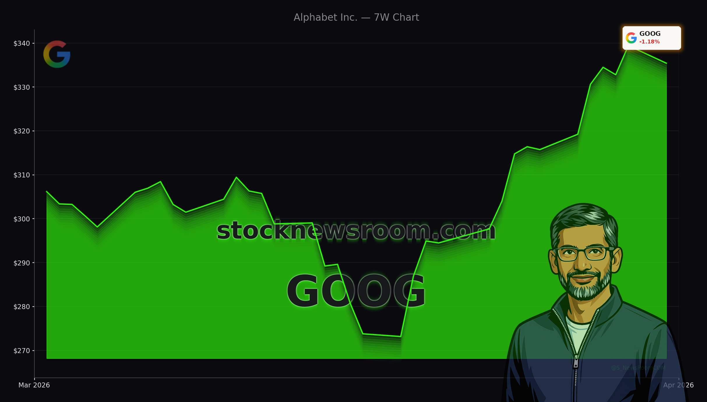 Alphabet (GOOGL) slipped modestly on Monday, with Class C shares (GOOG) closing near $335.40, down about 1.2% on the day, and Class A shares at $337.42. In after-hours trading, both lines were roughly flat, leaving the stock just below recent highs but still among the stronger performers in the NASDAQ 100 this month. The pullback comes after a sharp run from roughly $273 at the end of March to the mid-$330s by mid-April, a gain of nearly 24% in three weeks.