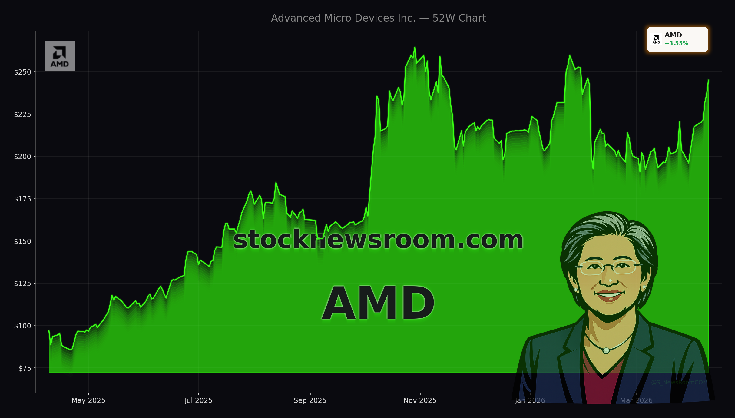 AMD climbed about 3.5% on Friday to roughly $245.04, modestly below the prior close of $245.55, and is slightly lower in pre-market trade on Monday. The move came alongside broad strength in chipmakers after a strong quarterly revenue update from TSMC underscored resilient AI infrastructure spending. AMD continues to trade well above key moving averages, a sign that bullish momentum in the name remains intact even after a huge multi-quarter run.