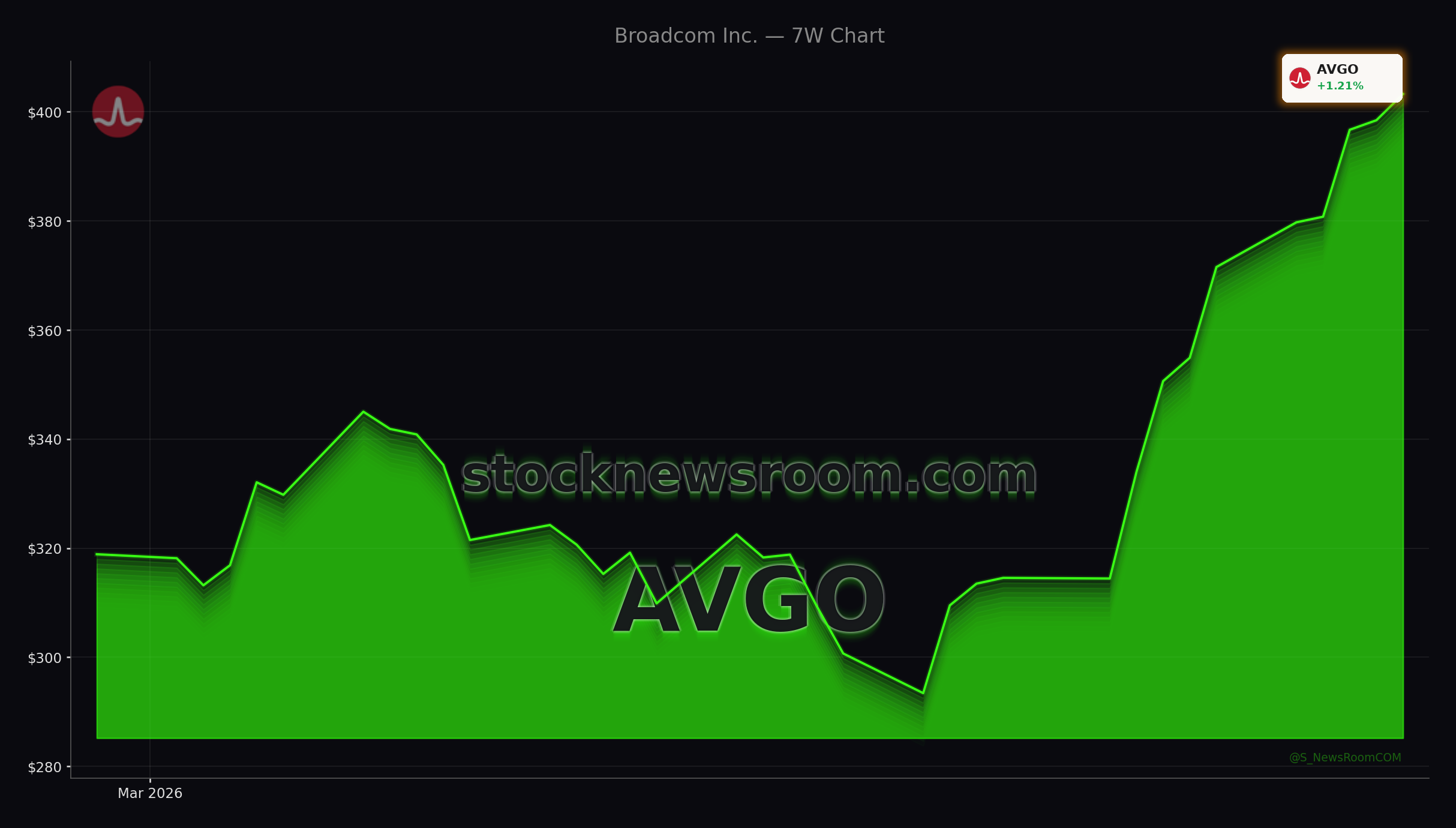 Broadcom Inc. (AVGO) traded around $402.98 in Friday’s session, up roughly 1.1% on the day and less than 3% below its all‑time closing high of $412.97 from December 2025. The stock is riding a nine‑session winning streak, up more than 28% over that stretch and over 30% month‑to‑date, outpacing much of the NASDAQ and even key AI names like NVIDIA over the past year. Technically, AVGO is extended, sitting well above its 20‑day and 100‑day moving averages with an overbought RSI in the high 70s, which raises the risk of a short‑term pullback even as the underlying AI thesis strengthens.