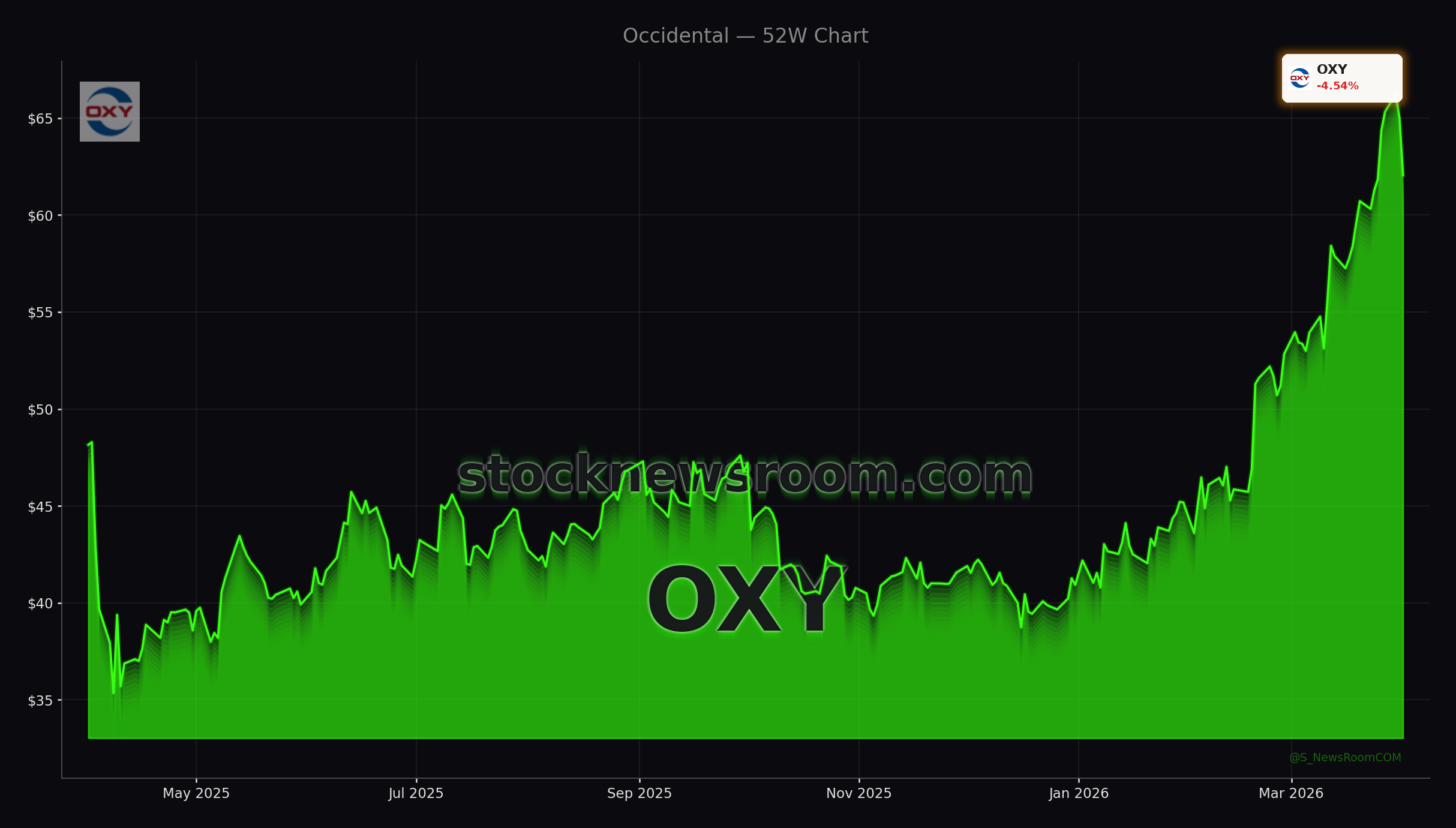 Occidental Petroleum Corporation fell as much as 3.5% in early moves, trading in lockstep with declines in peers like Exxon Mobil and Chevron. The stock had previously benefited from a powerful war-driven rally in March, with energy names among the few S&P 500 sectors posting double-digit gains while the broader market struggled. OXY itself has recently traded near its 52-week highs, putting today’s pullback into context as a correction rather than a collapse.