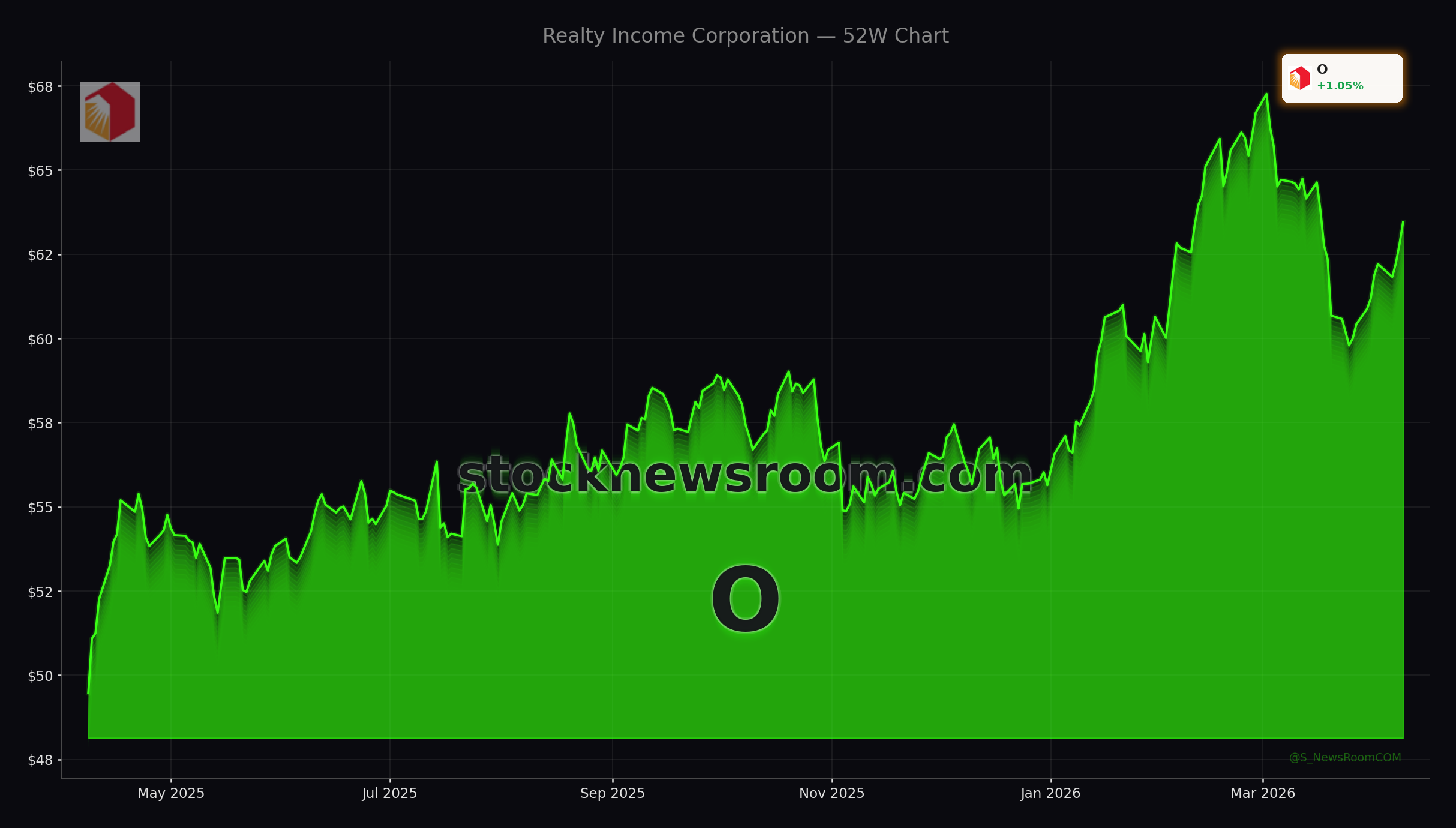 Realty Income Corporation brands itself as “The Monthly Dividend Company” for a reason: it has paid and increased its dividend annually for more than three decades, with over 114 consecutive quarterly hikes. At today’s price near $63.45, the forward yield of roughly 5% positions O as a high-yield alternative to Treasuries and investment-grade corporate bonds. Unlike fixed coupons, however, the Realty Income Dividend Strategy aims for slow but steady payout growth, historically around 3.8% to 4.2% annually over the long term.