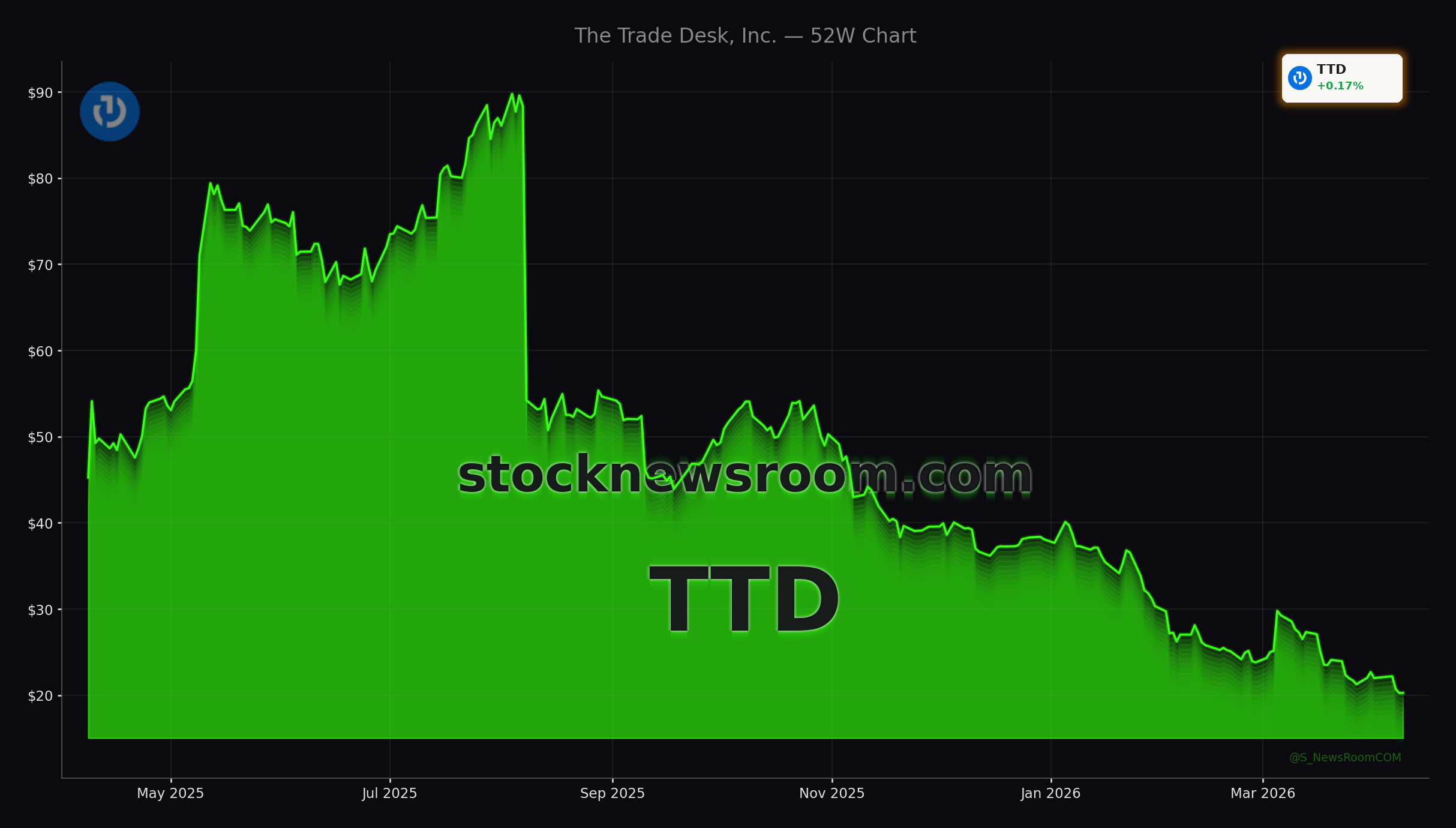 At $20.41 in Thursday’s session, The Trade Desk, Inc. trades only marginally above its previous close of $20.23, up 0.81% intraday but still deep in bear‑market territory for the past year. The stock is down more than 50% over 12 months and roughly 47% year to date, a sharp reset for a digital advertising name once treated as a premium growth compounder on the NASDAQ. Options “whale” activity in recent sessions shows traders actively positioning around elevated volatility rather than a clear bullish or bearish consensus.